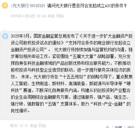 【大河财立方消息】12月22日,光大银行在互动平台上回应投资者“是否符合发起成立AIC的条件”提问。