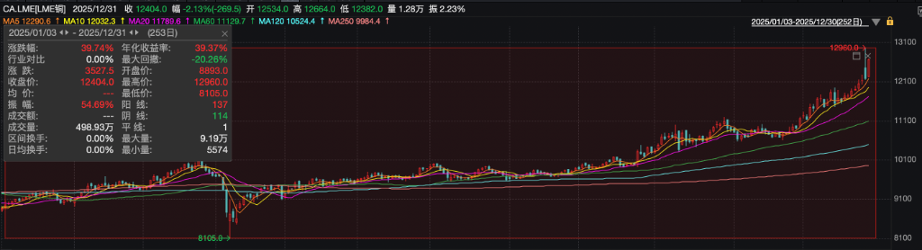 基本金属市场同样表现强劲。伦铜全年上涨近44%,创2009年以来最大年度涨幅,并在年末触及12960美元的历史高位。